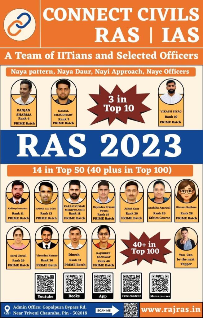Connect Civils RAS 2023 Success : This page features the names and ranks of RAS 2023 toppers who were students of Connect Civils. These students benefited from Connect Civils various programs, including PRIME Batch, RIPA Courses, VIP Batch, Kalam Batch, Target-120 Batch, Ethics Course, Prelims and Mains Test Series and Interview Guidance(PRIME BATCH). Connect Civils