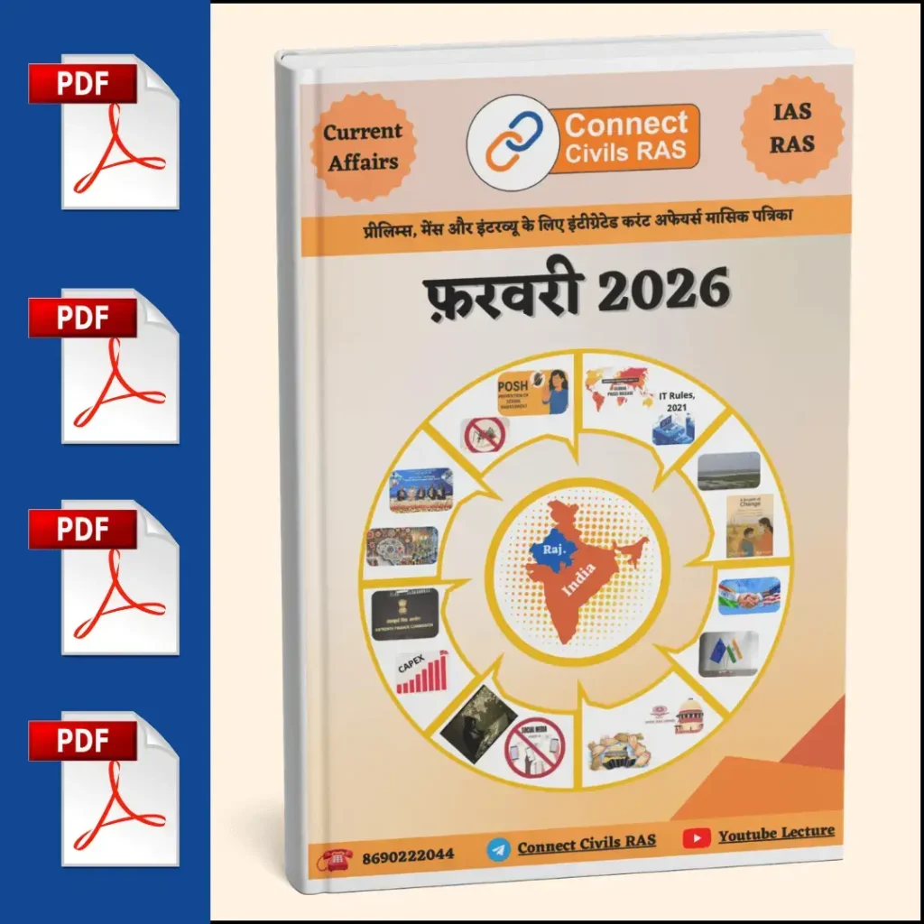 मैगज़ीन ईयर 2026 कनेक्ट सिविल्स द्वारा प्रकाशित एक व्यापक संस्करण है, जिसे विशेष रूप से आरएएस प्रारंभिक, मुख्य परीक्षा और साक्षात्कार की तैयारी के लिए तैयार किया गया है। इसमें वर्ष 2026 के सबसे महत्वपूर्ण करेंट अफेयर्स शामिल हैं, जो अभ्यर्थियों को सटीक, संक्षिप्त और परीक्षा से संबंधित सामग्री प्रदान करते हैं, ताकि वे पूरे वर्ष अपनी प्रदर्शन क्षमता को बढ़ा सकें।
