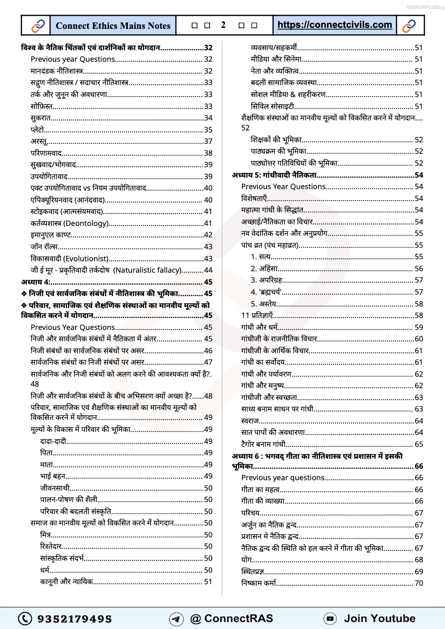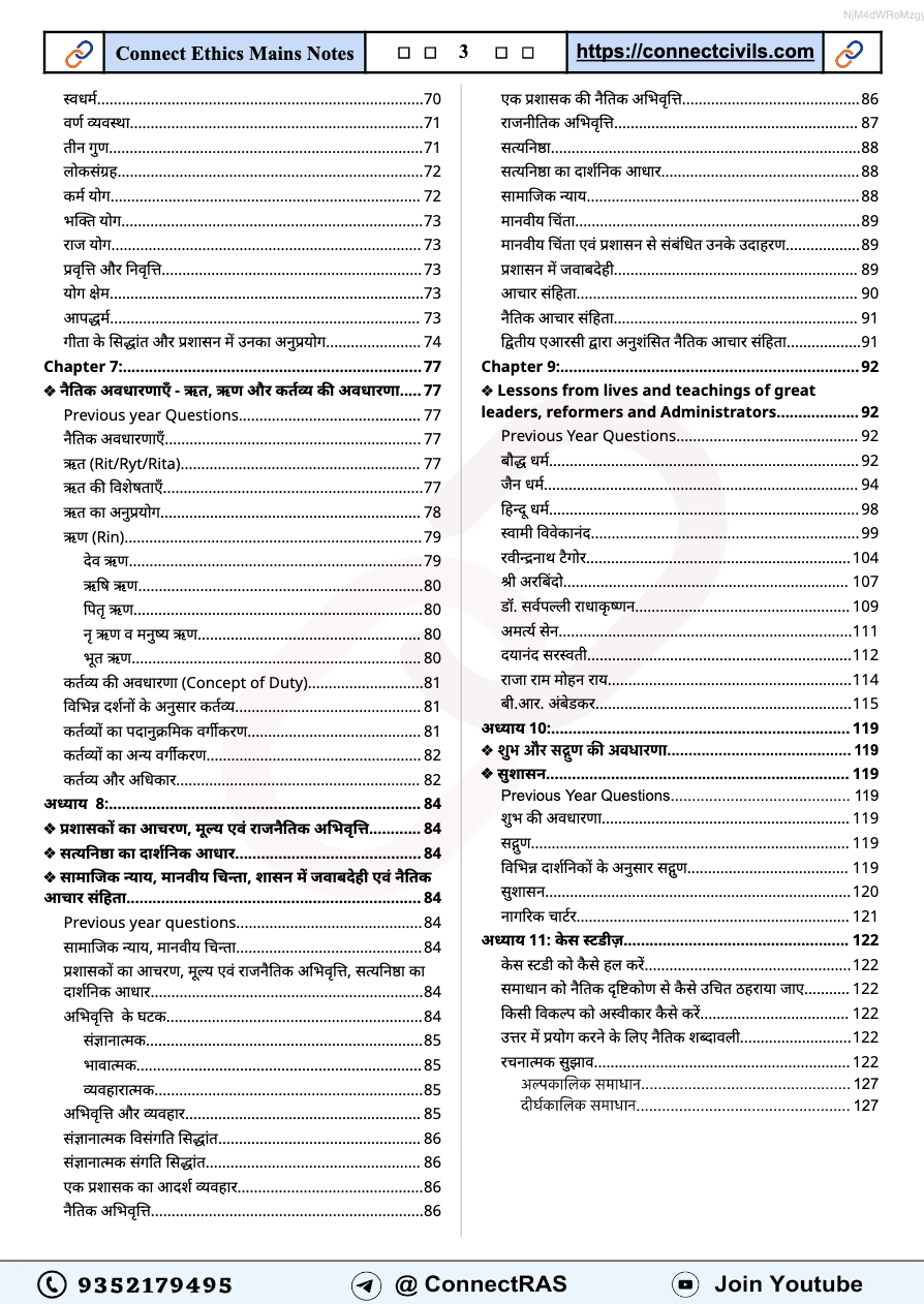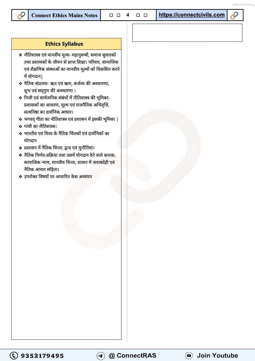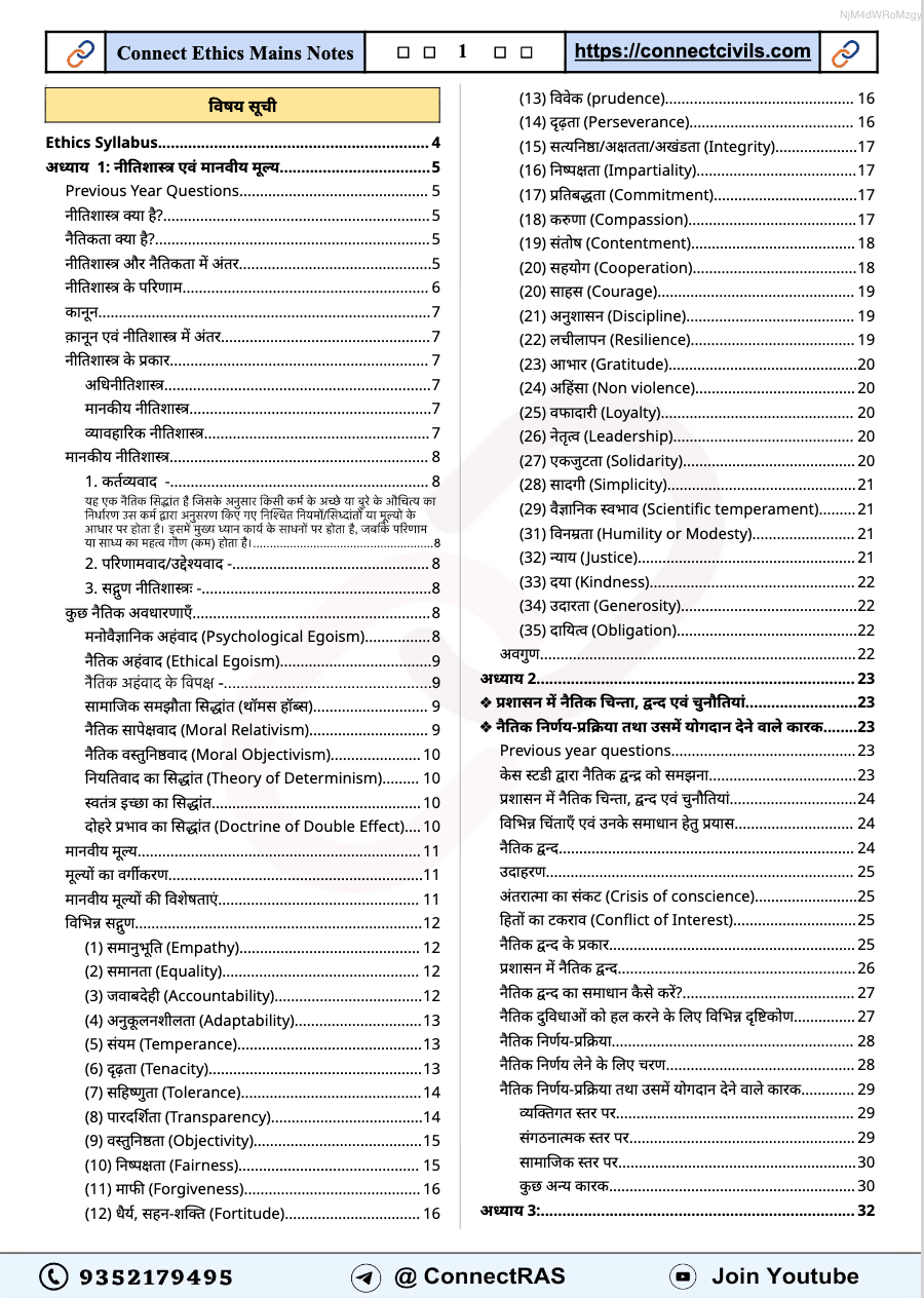 Get the latest Administrative Ethics (नीतिशास्त्र) PDF Notes (2025–26 Edition, Hindi Medium) from Connect Civils, specially designed for RAS Mains exam. These notes cover key topics such as लोक प्रशासन में नैतिकता के सिद्धांत, सत्यनिष्ठा, उत्तरदायित्व, पारदर्शिता, सुशासन में नैतिक मूल्य, भावनात्मक बुद्धिमत्ता, दृष्टिकोण (Attitude) और सिविल सेवा के मूल मूल्य. Ideal for quick revision and conceptual clarity, this edition ensures complete coverage as per the latest syllabus and exam pattern.