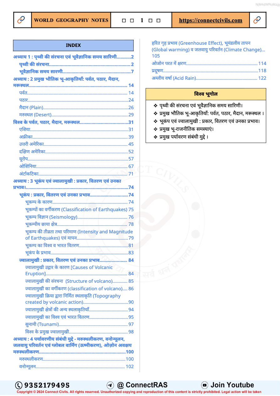 Get the latest World Geography (विश्व भूगोल) PDF Notes (2025–26 Edition, Hindi Medium) from Connect Civils, specially designed for RAS Mains exam. These notes cover key topics such as भूगोल की आधारशिला, पृथ्वी की संरचना और प्रक्रियाएँ, मौसम और जलवायु, प्राकृतिक संसाधन, स्थलाकृति और जल संसाधन, मानचित्र अध्ययन, तथा भूगोल से संबंधित महत्वपूर्ण घटनाएँ और वैश्विक मुद्दे. Ideal for quick revision and conceptual clarity, this edition ensures complete coverage as per the latest syllabus and exam pattern.
