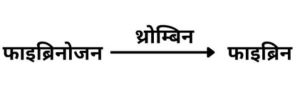 - ‘थ्रोम्बिन’ प्लाज्मा में उपस्थित फाइब्रिनोजन को उत्प्रेरित करता है और उसे फाइब्रिन नामक अघुलनशील तंतुओं में बदल देता है।
