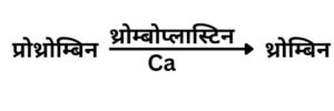 - थ्रोम्बोप्लास्टिन एवं कैल्शियम की उपस्थिति में रुधिर में उपस्थित प्रोथ्रोम्बिन नामक पदार्थ ‘थ्रोम्बिन’ में परिवर्तित हो जाता है।