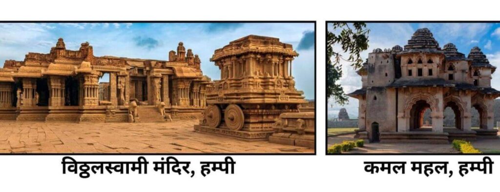 | उदाहरण | विठ्ठलस्वामी मंदिर, विरुपाक्ष मंदिर, कमल महल, हज़ारा मंदिर, शेष पर नरसिंह मूर्ति |