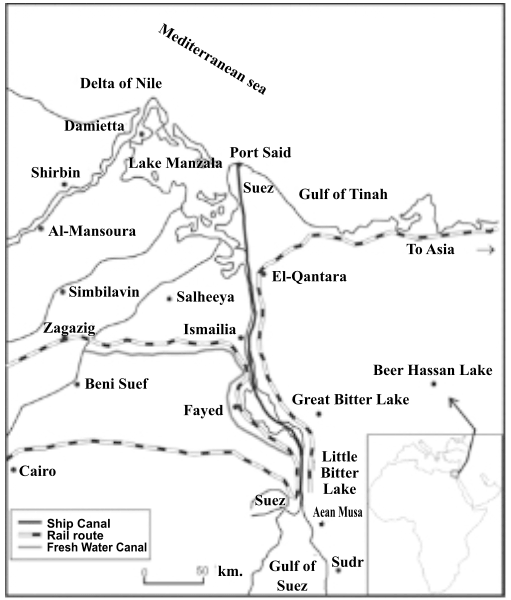 भूमध्य सागर ↔ लाल सागर ↔ हिंद महासागर |