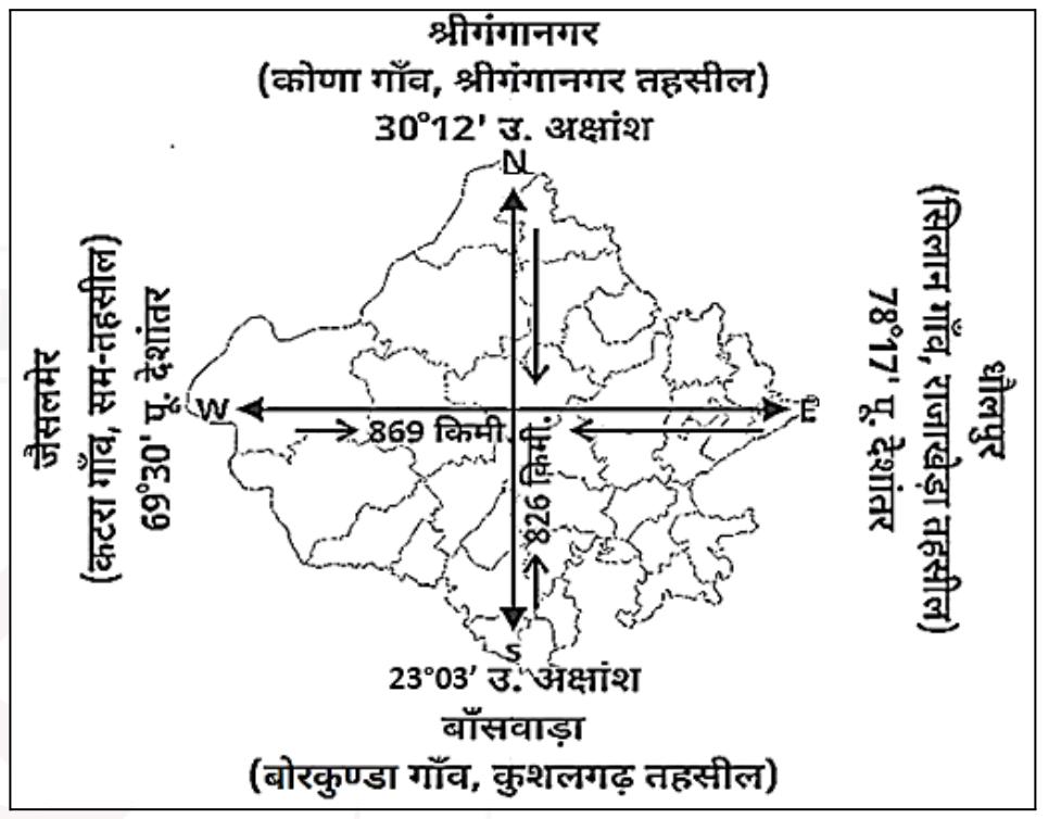 • राजस्थान अक्षांश के अनुसार उत्तरी गोलार्ध में और देशांतर के अनुसार पूर्वी गोलार्ध में स्थित है।