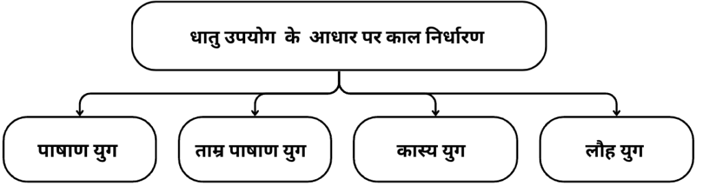 अध्ययन की सुविधा के लिए मानव द्वारा किए गए धातु के उपयोग के आधार पर काल निर्धारण किया गया हैं जो निम्नलिखित रेखाचित्र से समझाया गया हैं ।