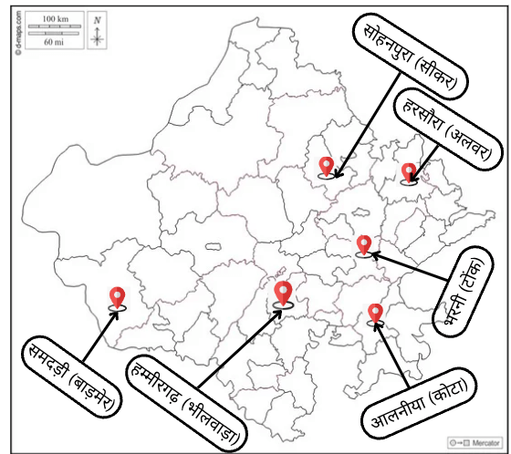 • प्रमुख स्थल:- विराटनगर (कोटपूतली-बहरोड़),हम्मीरगढ़ (भीलवाड़ा),भरनी (टोंक),सोहनपुरा (सीकर),हरसौरा (अलवर),समदड़ी (बाड़मेर),आलनीया (कोटा)