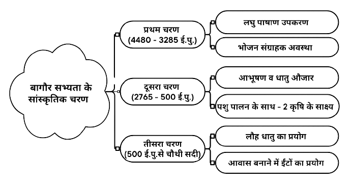 नोट :- मध्यपाषाण युगीन, ताम्र युगीन, लौह युगीन सभ्यताओं के साक्ष्य मिले हैं परन्तु नव पाषाण के साक्ष्य प्राप्त नहीं हुए हैं।