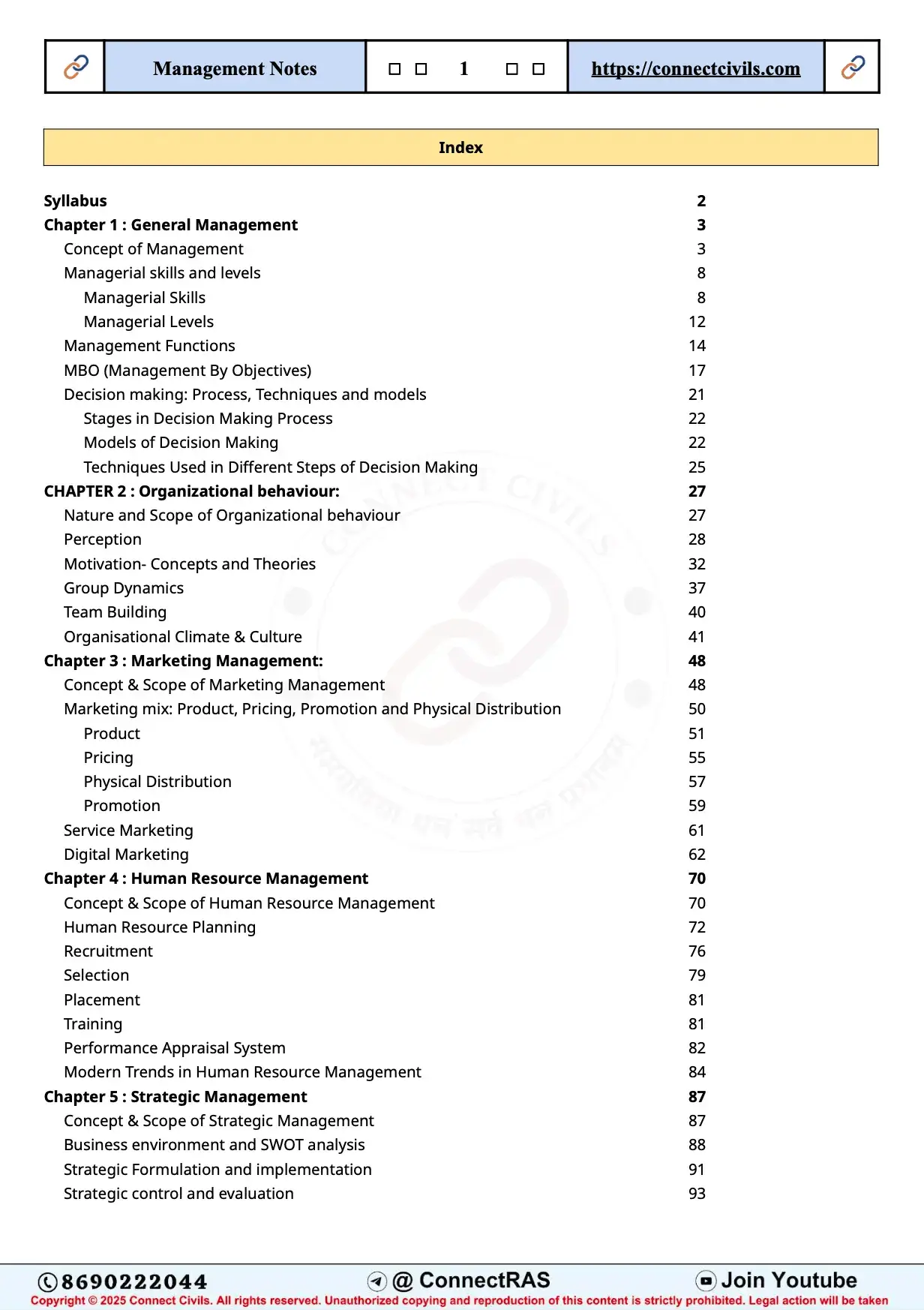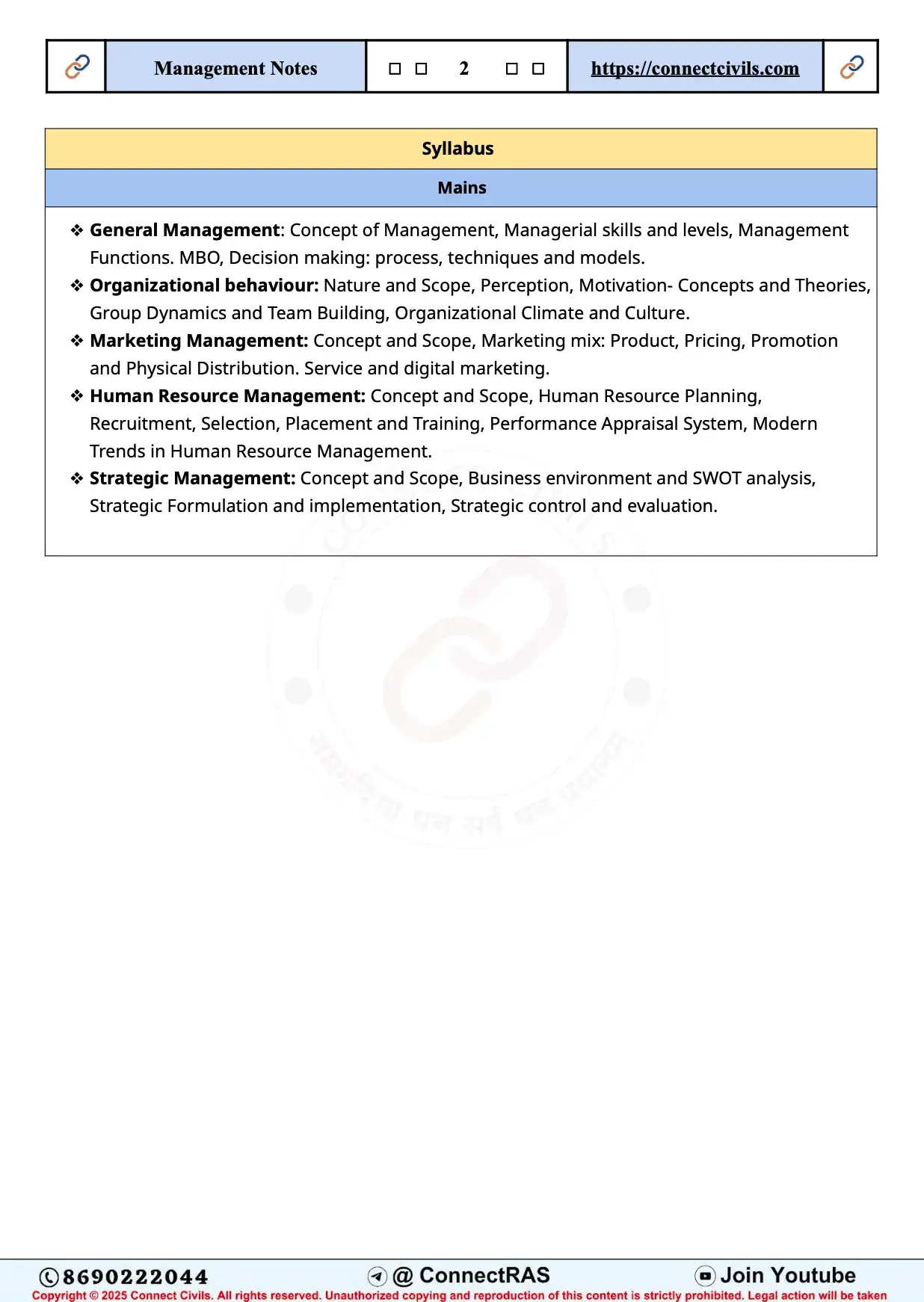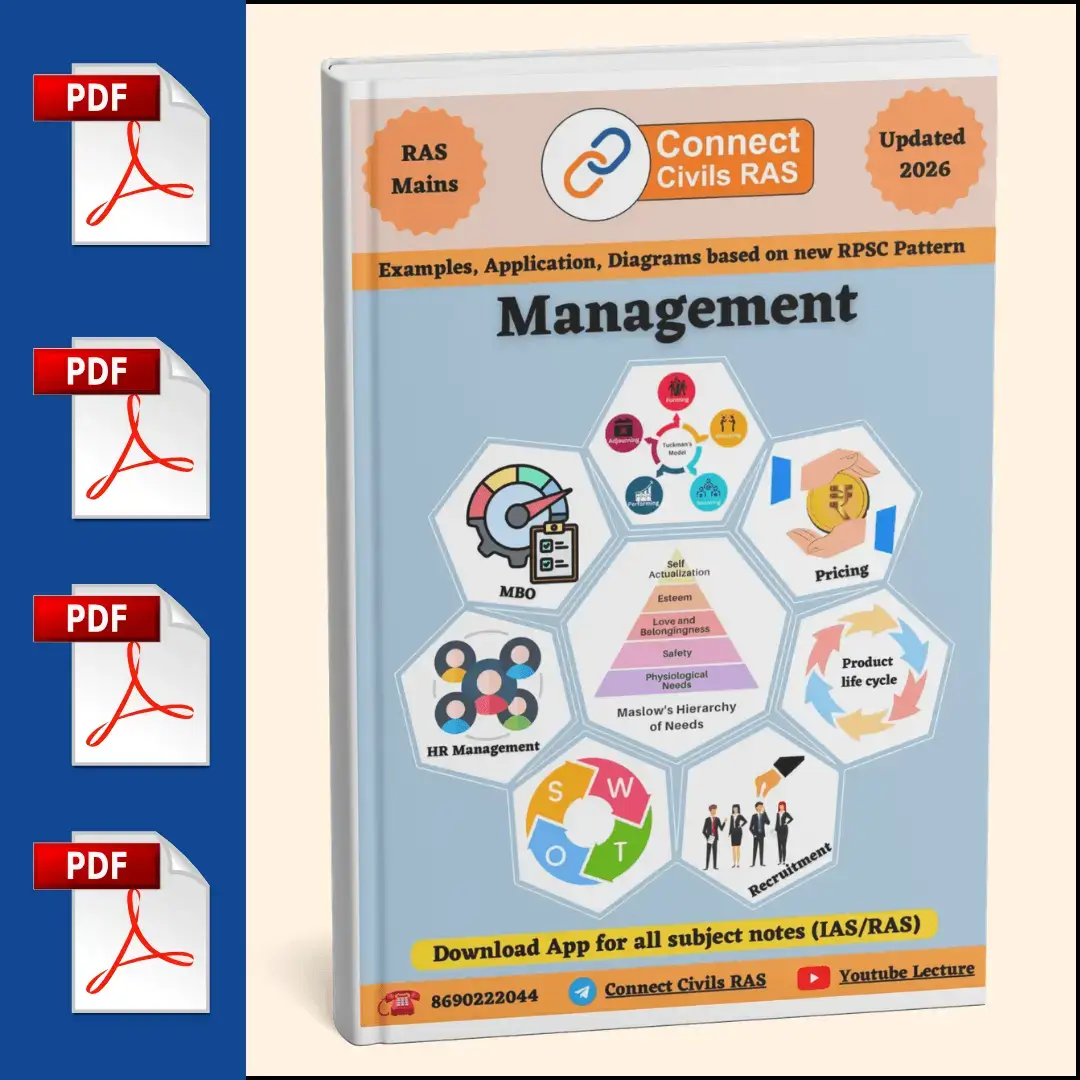 Management PDF Notes (2026–27 Edition) Get the latest 2026–27 edition of Management Notes from Connect Civils, designed for RAS Mains, UPSC, and other civil services exams. These comprehensive, well-organized notes cover key topics such as Principles of Management, Organizational Behavior, Strategic Management, Leadership, and Decision Making. Perfect for quick revision and concept clarity, this PDF helps aspirants stay updated with the latest syllabus and examples.