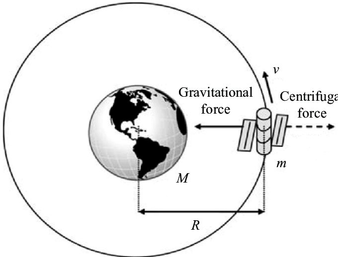 - The gravitational force pulling the satellite towards the Earth is balanced by the centrifugal force due to its circular motion.