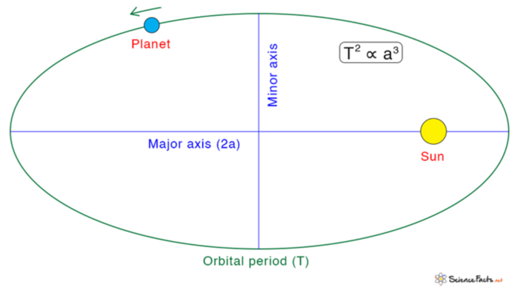 3. Law of Periods:The square of the time period of a planet’s revolution around the Sun is proportional to the cube of the semi-major axis of its elliptical orbit.