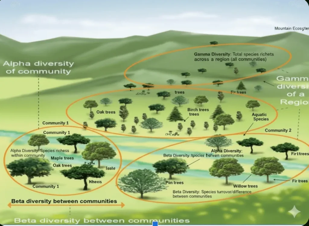 It is the measure of number of species found in a community.R. H. Whittaker introduced the ecological concepts of alpha, beta, and gamma diversity in 1972 to measure biodiversity across different spatial scales.