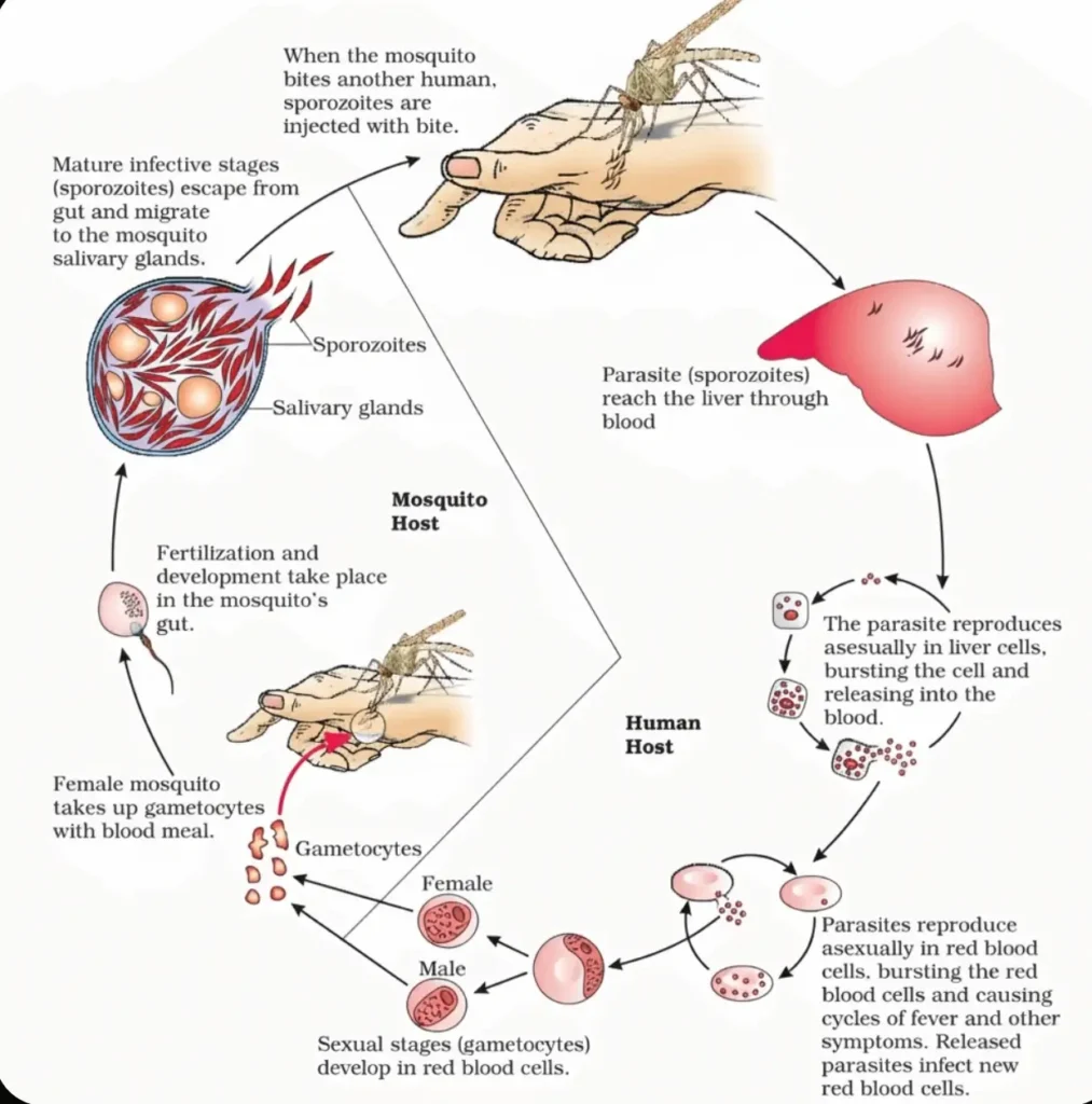 | Malaria | Plasmodium sp. (P. vivax, P. falciparum, P. malariae, P. ovale) | Bite of a Female Anopheles mosquito | Fever with chills, headache, vomiting, weakness |