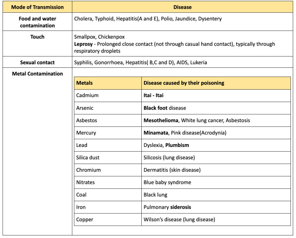 Infectious Diseases – These diseases are caused by pathogens and parasites. These can be transferred from an infected person to a healthy person. Thus also called communicable disease. Transmission may be through direct contact or by factors such as blood and serum.