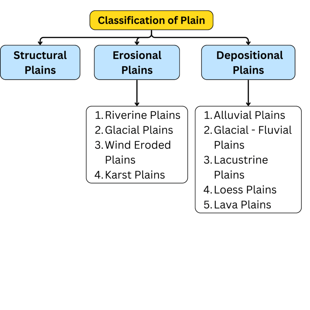- Calcareous / Karst plains: Formed in limestone regions due to long-term underground water erosion, producing a karst plain.