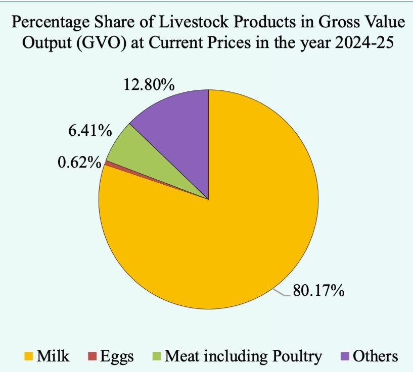 • At current (2024 – 25 ) prices, livestock contributes  46.77 % in the Agriculture and Allied sector.
